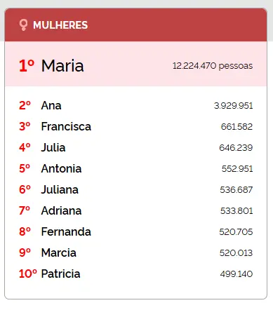 A lista ainda destaca outros nomes amplamente usados entre os brasileiros. Entre as mulheres, aparecem em seguida Ana, Francisca, Julia, Antonia, Juliana, Adriana, Fernanda, Marcia e Patricia. Já entre os homens, após José vêm João, Antônio, Francisco, Pedro, Carlos, Lucas, Luiz, Paulo e Gabriel.