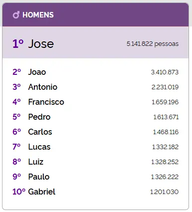 No campo dos sobrenomes, a liderança absoluta permanece com Silva, presente em mais de 34 milhões de pessoas, seguido por Santos (mais de 21 milhões), Oliveira, Souza, Pereira, Ferreira, Lima, Alves, Rodrigues e Costa.