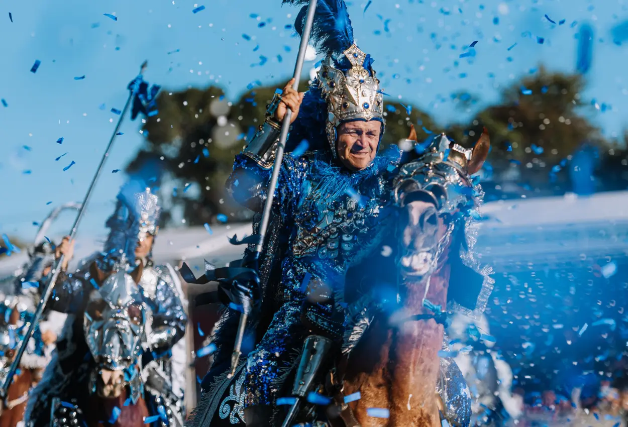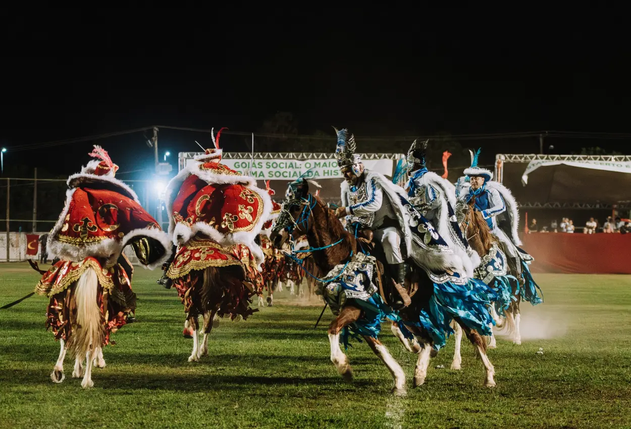 Inspiradas em torneios medievais europeus, as Cavalhadas encenam batalhas simbólicas entre cristãos, vestidos de azul, e mouros, de vermelho. No Brasil, a tradição remonta ao século XVII e, em Goiás, possui registros desde 1751, no antigo Arraial de Santa Luzia, atual Luziânia. A celebração segue como um elo vivo entre religiosidade, cultura popular e identidade histórica do estado.