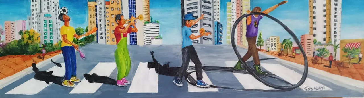 Detalhes: A exposição reúne quatro séries e um total de 15 obras que sintetizam a trajetória artística de Pedro Galvão. Com forte influência da cultura pop e de manifestações urbanas, o artista explora a arquitetura da cidade, faixas de pedestres e o cotidiano urbano como elementos simbólicos. Para Galvão, a cidade se torna palco: as faixas de pedestres surgem como picadeiros dos artistas circenses que atuam nas ruas das grandes metrópoles brasileiras.