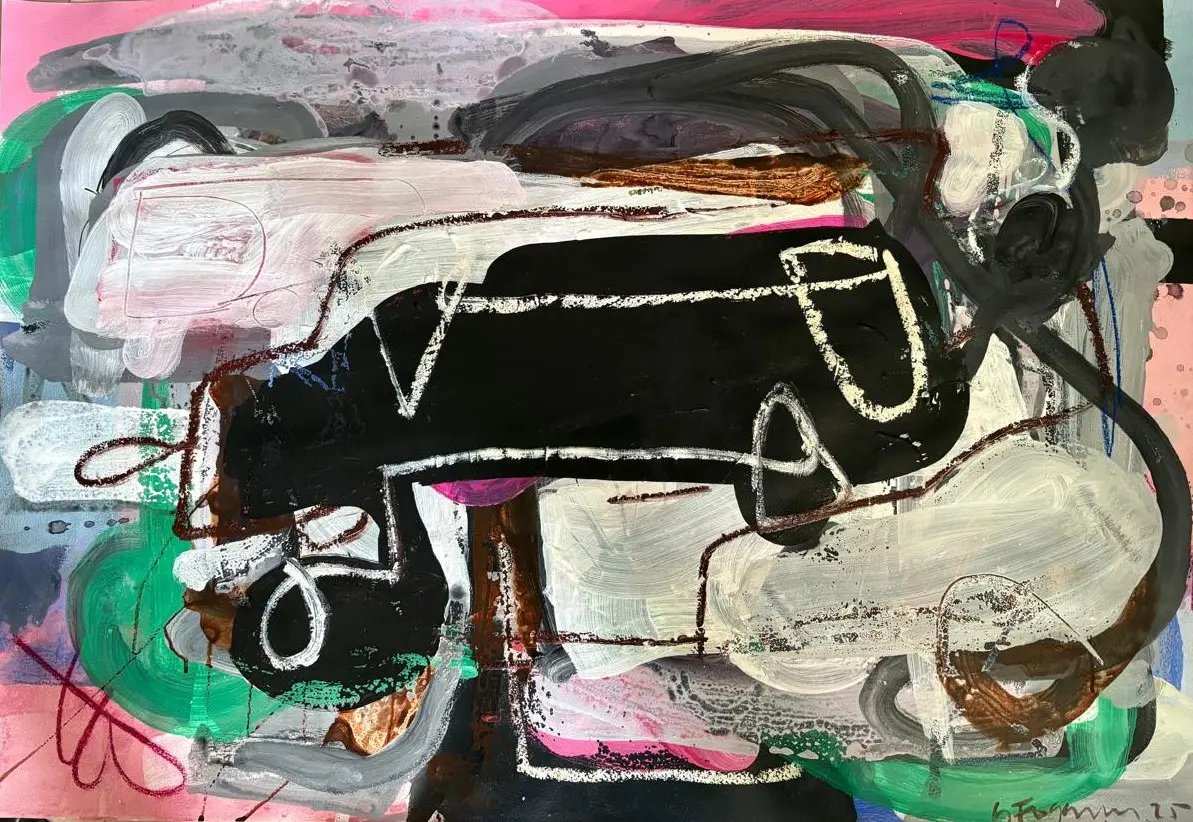 Mostra solo marca nova etapa da pesquisa do artista goiano, centrada no desenho como linguagem autônoma. Reúne obras sobre papel de algodão com técnicas mistas, explorando cor, gesto e abstração.